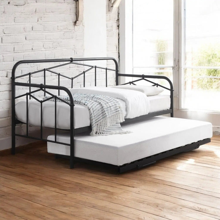 Add timeless elegance to your home with the Hackney Metal Day Bed With Trundle. This versatile piece features an Art Deco-inspired design available in a sand blast effect black or hand brush painted antique bronze finish for a sophisticated look. The sturdy yet lightweight steel frame and sprung wood slatted base provide comfortable support and enhanced airflow. Easily convert into a double bed with a pull-out guest bed. Perfect for sleepovers or unexpected guests! Have a look at our recommended mattresses to complete the set. (Recommended Max Trundle Depth of 20cm)