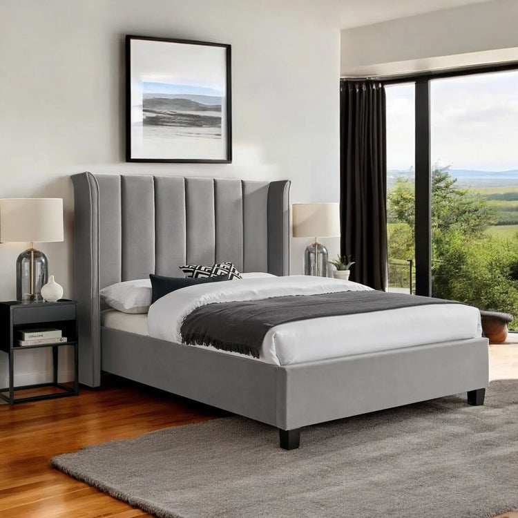 Transform your bedroom into a luxurious oasis with the Malpas Upholstered Bed Frame. Made from a 100% recycled low carbon velvet fabric in a variety of trendy colours, this bed not only exudes opulence but also has a reduced carbon footprint and minimizes plastic waste. With a tall winged headboard, modern lines, and a low foot end, this bed is perfect for ultimate comfort and style. Available in Double and King size. Boasts a flat wooden slatted base to give your mattress the ultimate support. Check out our range of mattresses available that would all perfectly match up with this stunning bed frame.